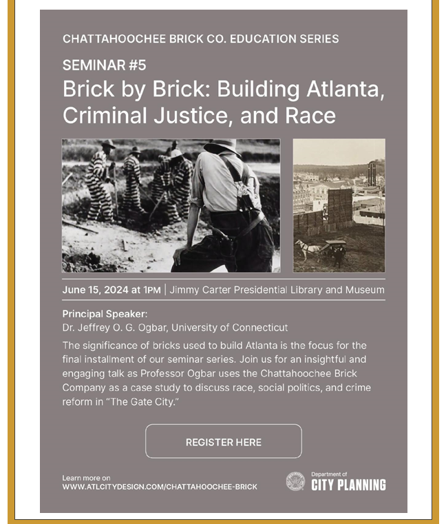 Many Atlanta residents are unaware of the enormous quantity of brick required to build the city we know today. Not only were buildings made of brick, but also streets, sewers, and sidewalks. This seminar will provide valuable information about brick and its role in building the Gateway City. The talk also will explore the dynamics of race in the city “too busy to hate,” as Atlanta’s built environment is racial—then, and now. The Chattahoochee Brick Company site, and its practices, provide meaningful insights into matters of race, social politics, and crime reform that are relevant today.