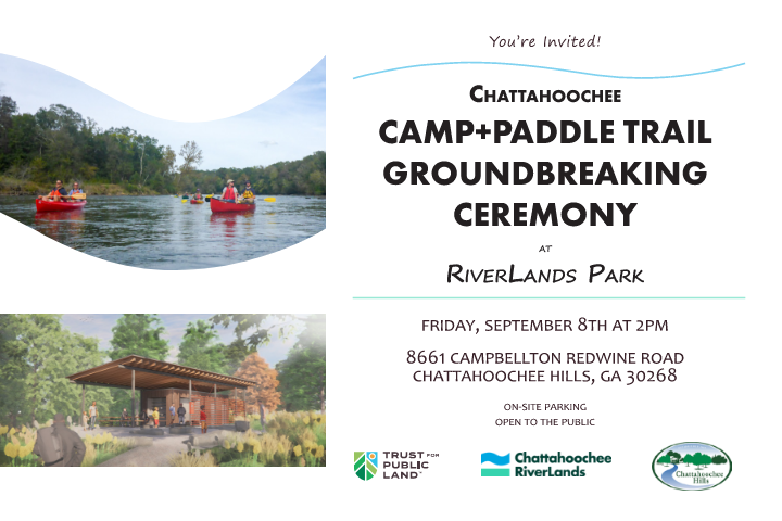 Chattahoochee Hills will be home to two of the five Chattahoochee Camp+Paddle Trail sites set to open Summer 2024. One of those sites is an existing park, Campbellton Park, will feature new amenities such as a beautifully designed restroom and shower pavilion, trails, primitive campsites, and a new pollinator garden. The other site, RiverLands Park, where the groundbreaking ceremony will take place, will open to the public next year as a new park in Chattahoochee Hills and will feature similar amenities as Campbellton, along with a new kayak launch.