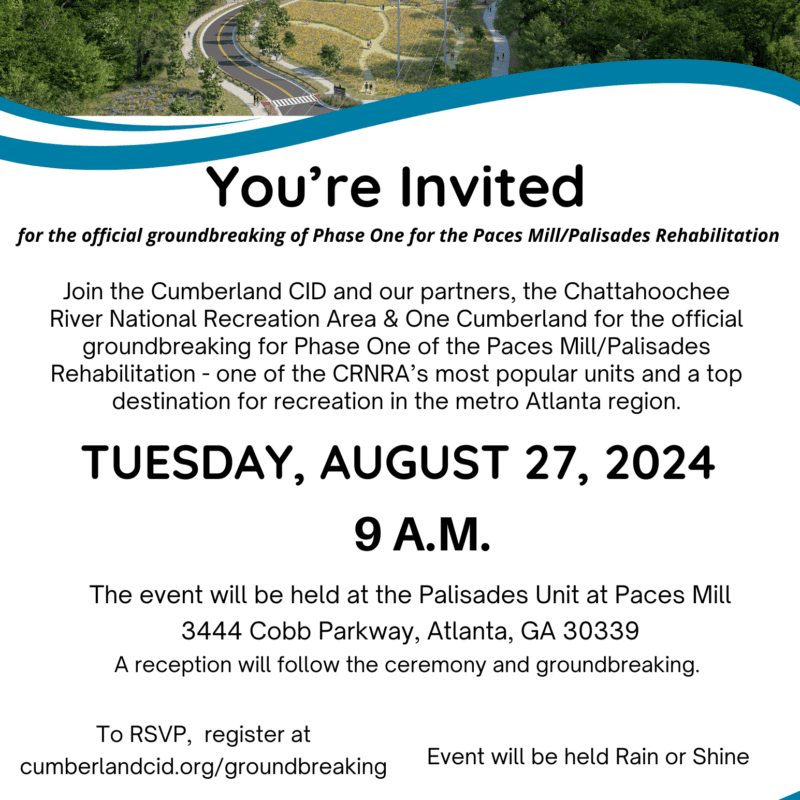 Join the Cumberland CID and our partners, the Chattahoochee River National Recreation Area & One Cumberland for the official groundbreaking for Phase One of the Paces Mill/Palisades Rehabilitation – one of the CRNRA’s most popular units and a top destination for recreation in the metro Atlanta region.