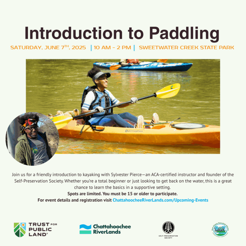 Join Self-Preservation Society and West Atlanta Watershed Alliance for a friendly introduction to kayaking with Sylvester Pierce—an ACA-certified instructor and founder of the Self-Preservation Society. Whether you’re a total beginner or just looking to get back on the water, this is a great chance to learn the basics in a supportive setting.
