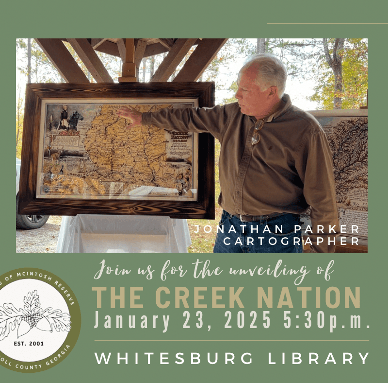 Please join Friends of McIntosh Reserve to unveil cartographer, Jonathan Parker’s new work: “Journey of People, Place, and Time, a Path to McIntosh”. This inspiring piece depicts the Creek Nation history will be on display at the Whitesburg Library.