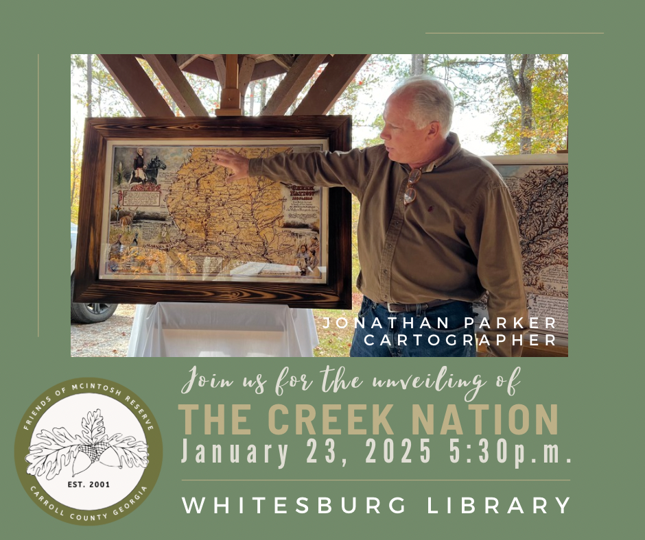 Please join Friends of McIntosh Reserve to unveil cartographer, Jonathan Parker's new work: "Journey of People, Place, and Time, a Path to McIntosh". This inspiring piece depicts the Creek Nation […]