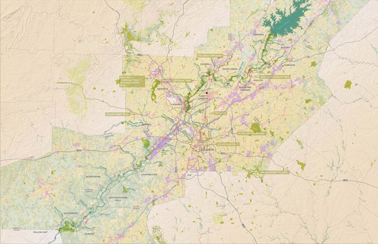 Land cover data reveals distinct characteristics and identities along the River. Sub-Area 1, north of Peachtree Creek, is relatively dominated by residential land and holds a significant portion of publicly owned land, creating opportunities for the Greenway study to connect separated parcels. Sub-Area 3 is primarily comprised of active agricultural and forested areas and fewer public land holdings. The land uses in Sub- Area 3 tend to occupy larger tracts of land and many are privately owned by a small number of individuals, indicating the need to think creatively about greenway development and strategic points for water access. Sub-Area 2, on either side of I-20, is mainly a mix of industrially-zoned land, as well as utility easements. This portion of the River presents a different set of design challenges in terms of access and experience, with MRPA protections creating forested buffers that should be carefully considered for trail planning. In each of these three Sub-Areas, it will be important for the greenway segments and associated amenities to respect and honor the characteristics of the surrounding land uses while creating an iconic identity for the corridor, making it a destination that highlights the assets of the greater region.