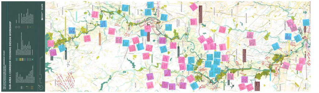 The Design Workshop also kicked off the corridor vision & concept phase that would synthesize an identity for the Chattahoochee RiverLands Greenway by using visioning, collaborative input, community response, and design workshops. Attendees were asked to add to, question, and refine the project goals of Protect, Invite, Engage and Redefine while working over maps of the northern stretch of the river – from Buford Dam to Marietta Blvd / S. Atlanta Rd. Download the complete summary of the March Sub-Area Committee Meetings to learn more.